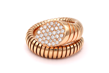 The flexible ring in 18K red gold has a gold weight of 13.50 grams. The comfortable ring is set with 35 brilliant cut diamonds in F-si quality, totaling 0.55 carats.
