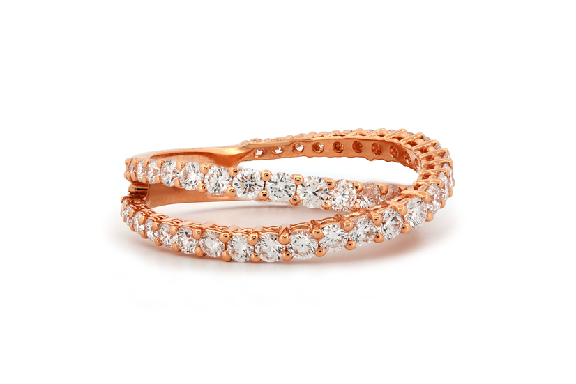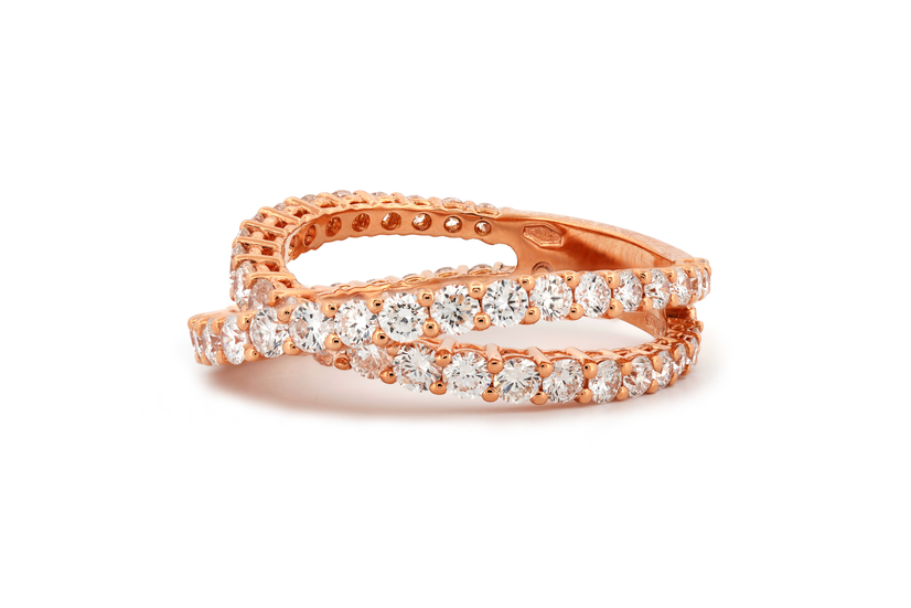Roségold Ring mit einem Feingehalt von 750 Anteilen. Mit der Ringgrösse 53.5 beträgt das Goldgewicht 3.70 Gramm. Der Ring ist besetzt mit 53 Brillanten in der Qualität F-vs von Total 1.64ct.