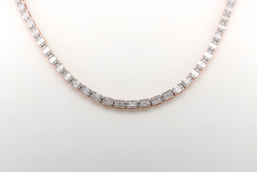 Roségold Collier mit einem Feingehalt von 750 Anteilen. Das Goldgewicht beträgt mit einer Länge von 42cm 21.20 Gramm. Der Halsschmuck ist besetzt mit 177 Diamanten im Baguette Schliff in der Qualität G-vs von total 4.75ct., 118 Diamanten im Princess cut in der Qualität G-vs von total 1.18ct. und ist ausgeschmückt mit 237 Brillanten in der Qualität F-si von total 1.00ct.