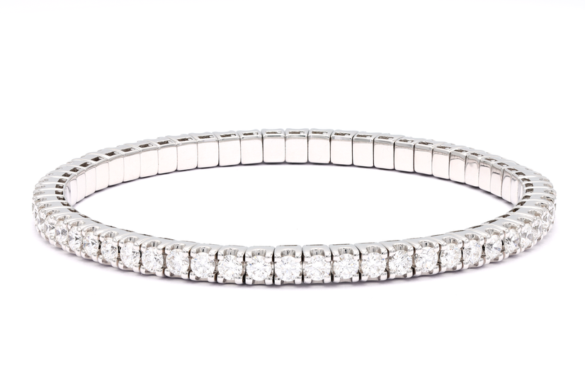 Weissgold elastisches Tennis Bracelet mit einem Feingehalt von 750 Anteilen. Das Goldgewicht beträgt 19.70 Gramm. Das Bracelet ist besetzt mit 60 Brillanten von Total in der Qualität F-si von Total 5.00ct.