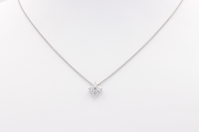 Weissgold Collier mit einem Feingehalt von 750 Anteilen. Das Goldgewicht beträgt 3.30 Gramm. Das Collier ist besetzt mit 5 Brillanten in der Qualität F-si von Total 0.40ct.